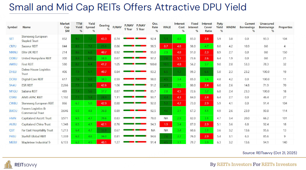 Small/Mid-cap, potential benefit from Singapore's Equity Market Development Program grant. High DPU (e.g., 7-9%). |