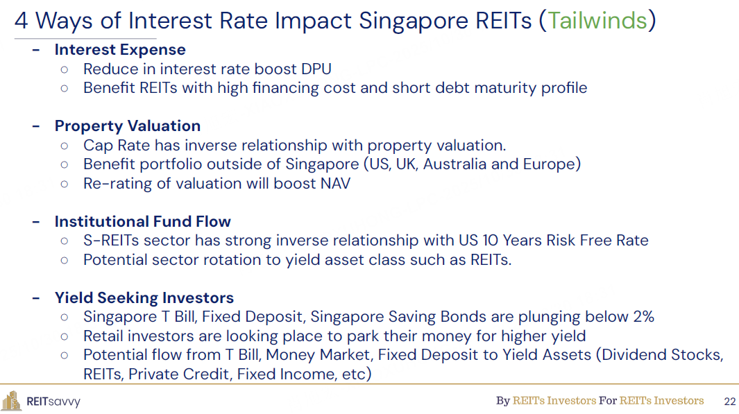 This expected interest rate reduction translates into four key benefits for S-REITs