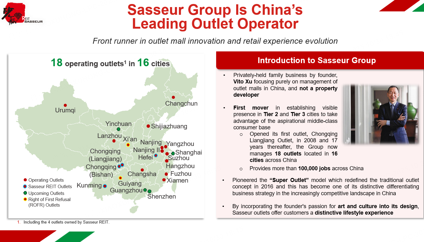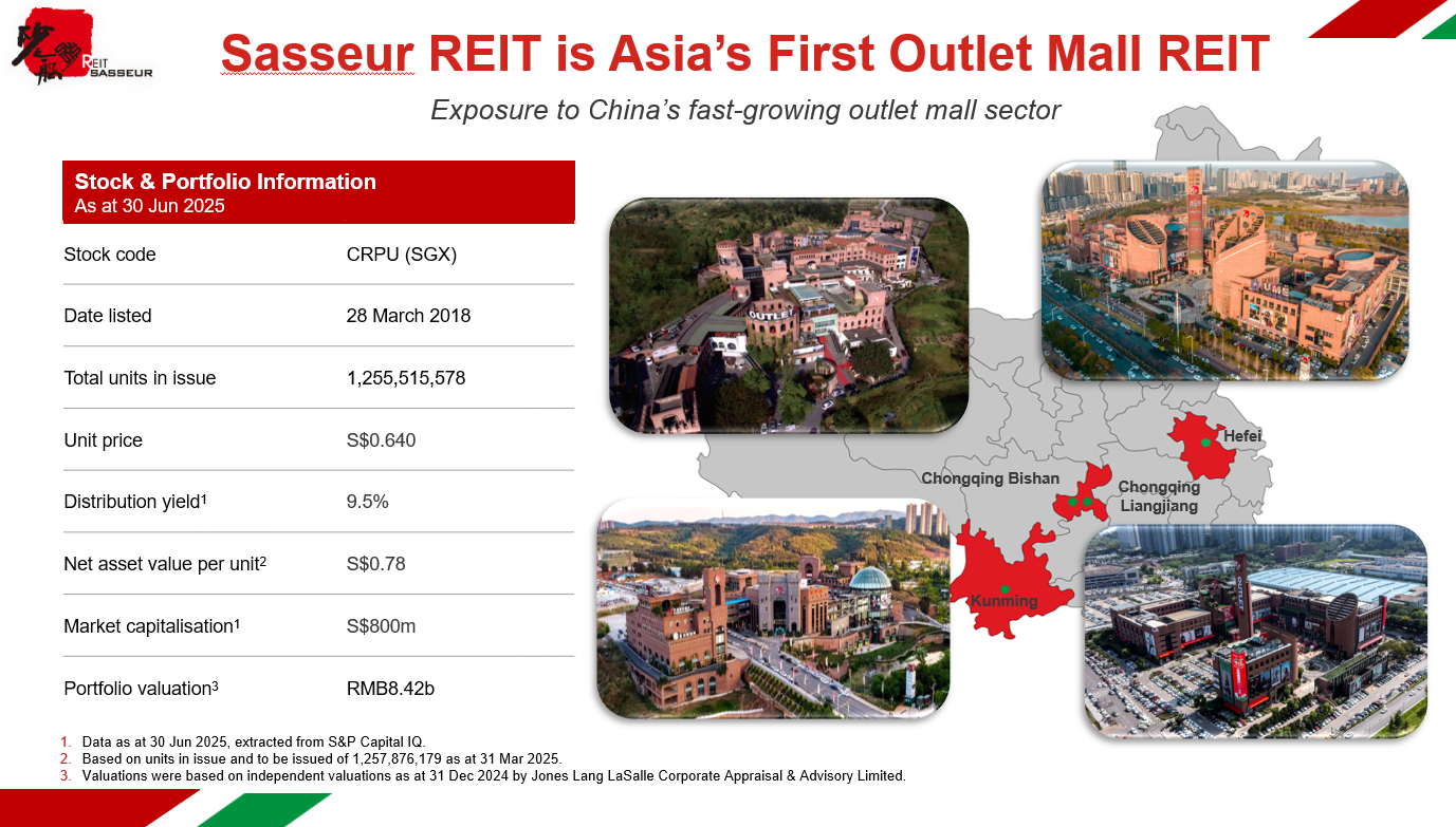 Growth Strategy: Sasseur REIT's growth will be driven by maximizing performance of existing core assets and strategic acquisitions in China, potentially from distressed developers. The sponsor group is also exploring expansion opportunities in Southeast Asia, which could eventually be injected into the REIT.