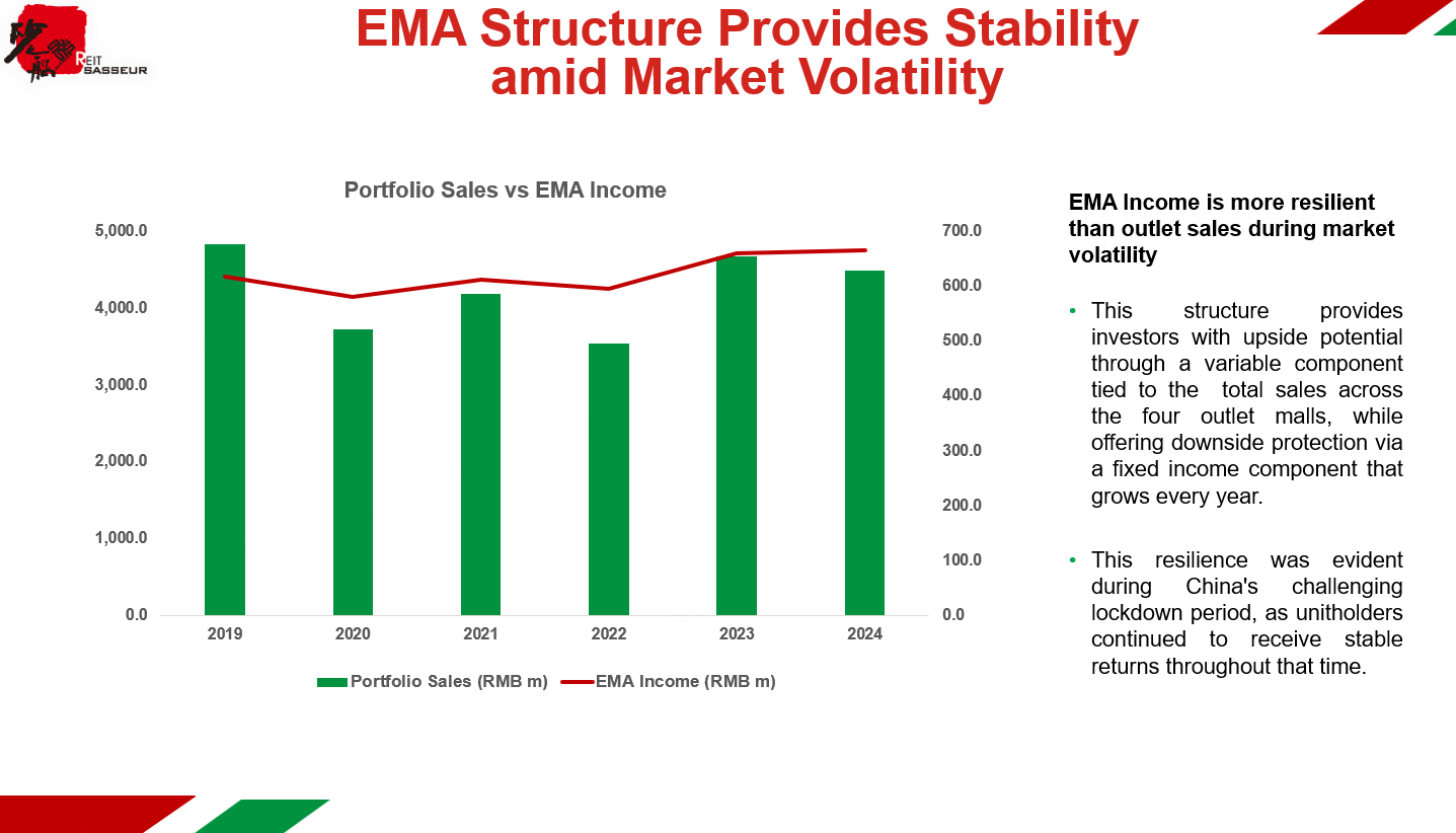 EMA Model for Stability: The unique Entrusted Management Agreement (EMA) structure provides income stability. Its rental income includes a fixed component (set at IPO and increasing 3% annually), offering downside protection, and a variable component tied to tenant sales performance, capturing upside.